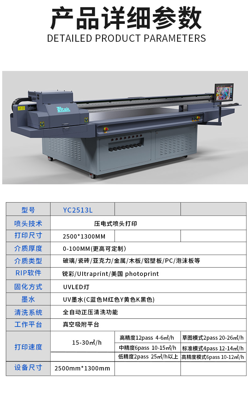 工业UV打印机是相对于民用型UV打印机而言的,顾名思义是用于工业生产打印, 稳定性好是前提,毕竟工业UV打印机的使用时间比较长,7*24小时是正常需求。另外,工业UV打印机使用的多为理光、京瓷类的工业级喷头,这类喷头的寿命和速度才能胜任高强度的打印要求。然后,在硬件的配置上,工业UV打印机一般在机架、平台的制造装配上有更高的要求,对于导轨、电机、风机等零部件的选择都会倾向一些国内知名或进口品牌,如此也才能赋予整机良好的性能。另外,工业UV打印机由于对设备的要求比广告加工行业要苛刻许多,那么选择靠谱的品牌厂家显得格外重要。